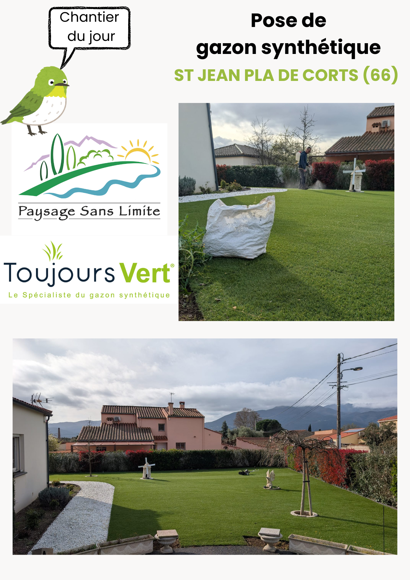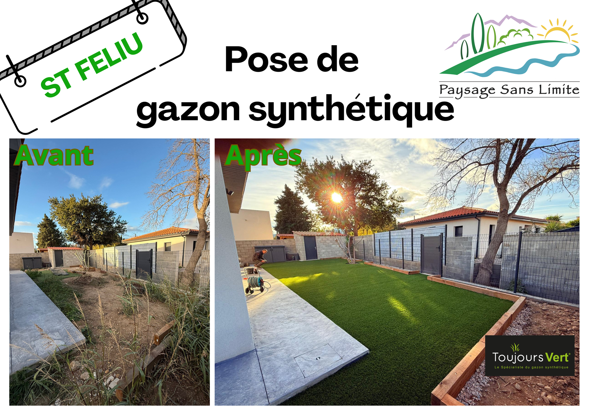 Très satisfait de la pose de gazon synthétique par Toujours Vert 66. De bons conseils, excellente qualité de gazon, un travail sérieux et soigné en finitions. Délai de pose respectés. Une équipe de spécialiste très professionnelle, compétente et sympathique. Merci à Toujours Vert 66.