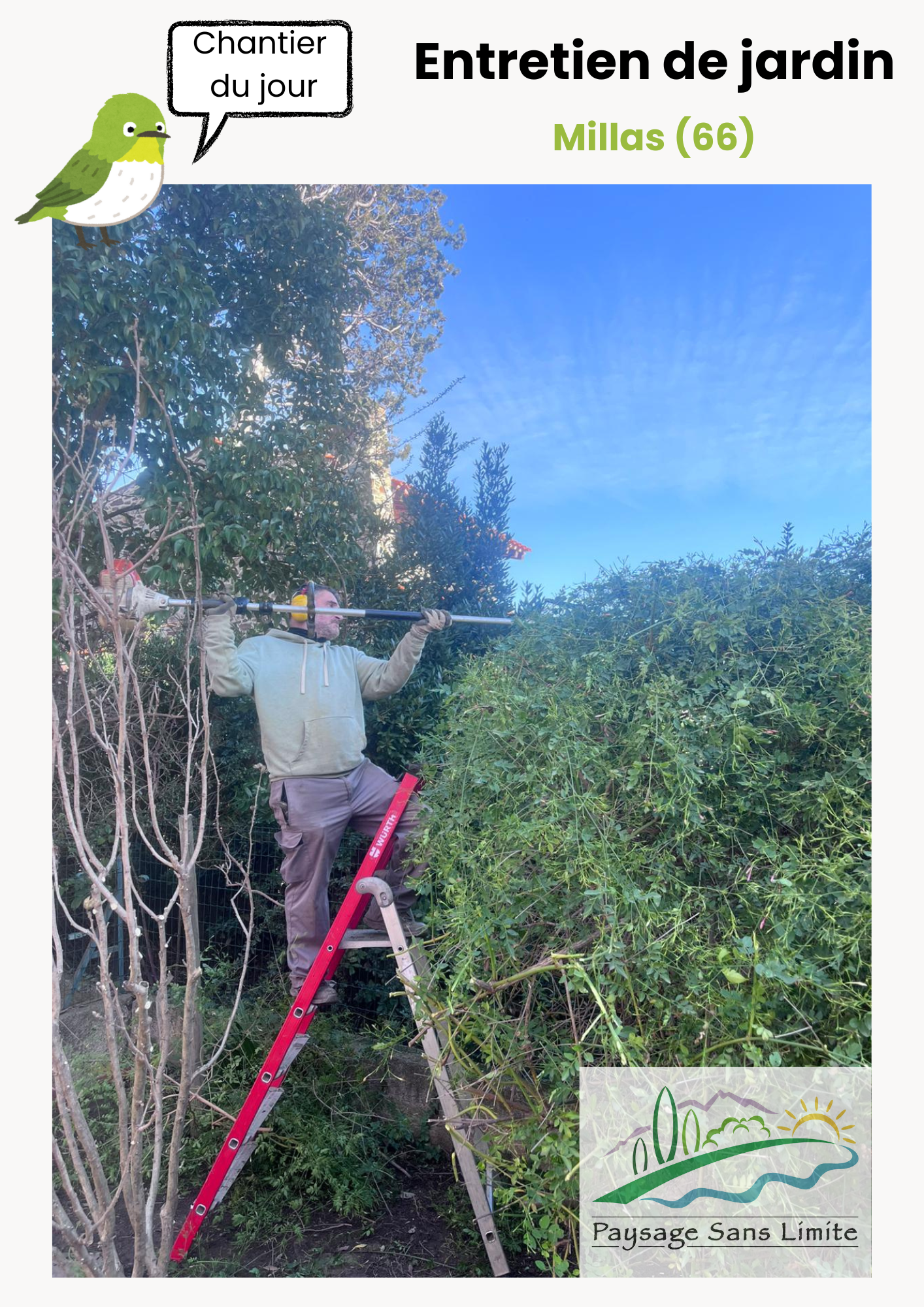 🎄 Dernière ligne droite avant Noël : entretien complet d’un jardin à Thuir À l’approche des fêtes de fin d’année, Paysage Sans Limite a réalisé l’un de ses derniers chantiers de la saison à Thuir. Notre équipe est intervenue pour redonner tout son éclat à un jardin qui nécessitait un entretien complet. ✂️ Un jardin remis en beauté avant les fêtes Nos travaux ont compris : La taille des haies La taille des fruitiers Le désherbage des zones envahies Le nettoyage et la remise en forme générale des espaces extérieurs Un soin particulier a été apporté pour offrir à nos clients un jardin propre, harmonieux et prêt à accueillir la période festive. 🎅 Une période où nous faisons une pause Comme chaque année, notre entreprise prend quelques jours de vacances pour Noël, une tradition qui nous permet de nous ressourcer avant d’entamer la nouvelle saison. Nous remercions tous nos clients pour leur confiance en 2025 et nous leur souhaitons de très belles fêtes de fin d’année ! ✨